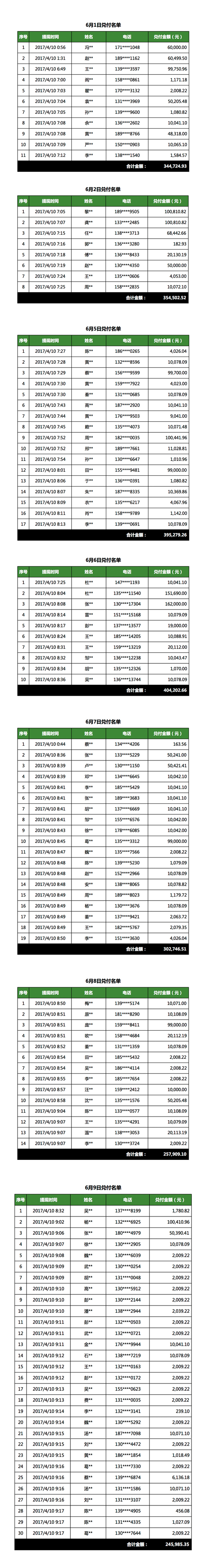 綠能寶公司自6月1日啟動工作日持續(xù)兌付。截止6月9日,共完成109人,合計金額 2,305,350.33 的兌付,詳情如下: