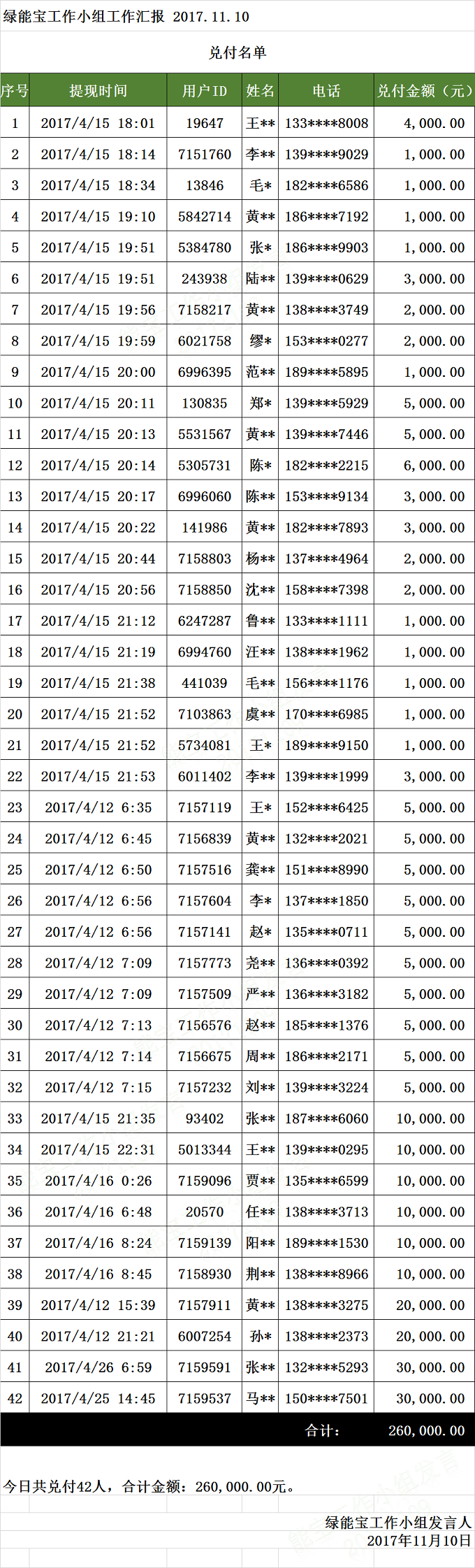 兌付名單(2017年11月10日)