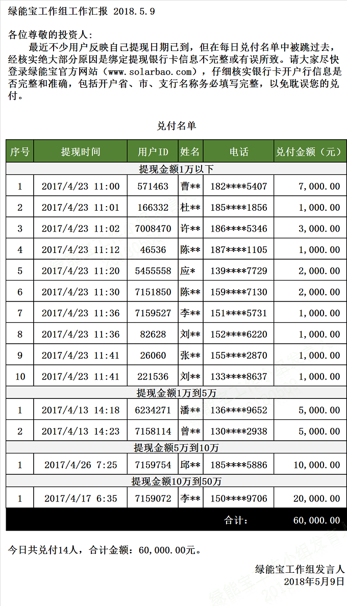 兌付名單(2018年5月9日)