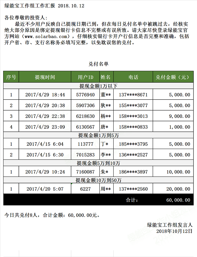 兌付名單(2018年10月12日)