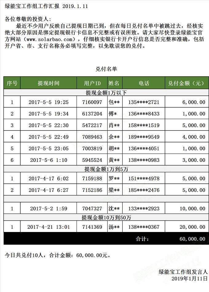 兌付名單(2019年1月11日)